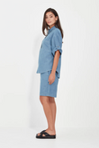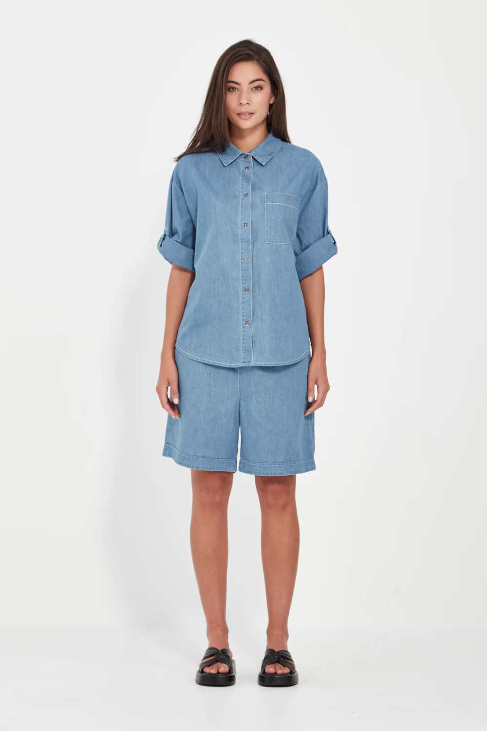 The Alex Shirt from Verge is a relaxed, contemporary staple crafted from soft-washed chambray denim. Featuring a button-through front, patch pocket, and ¾ sleeves with roll-tab detailing, it blends casual ease with modern polish. The slightly boxy silhouette adds a fresh, effortless edge—perfectly paired with the matching Alex Pant or Short for an elevated, coordinated look.