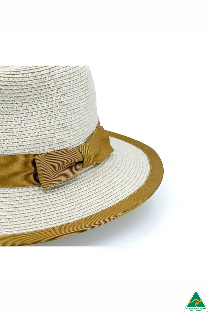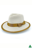 In a crisp ivory hue, this elegant piece is elevated by a distinctive gold ribbon trim that gracefully accents both the crown and the edge of the brim - blending old-world charm with a fresh, fashion-forward twist.