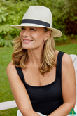 Its structured silhouette is elevated by a deep navy ribbon band, accented with a contrasting side detail, offering a subtle touch of distinction and modern elegance. Lightweight, durable, and UPF50+ rated, the Clarence provides exceptional sun protection without compromising on style.