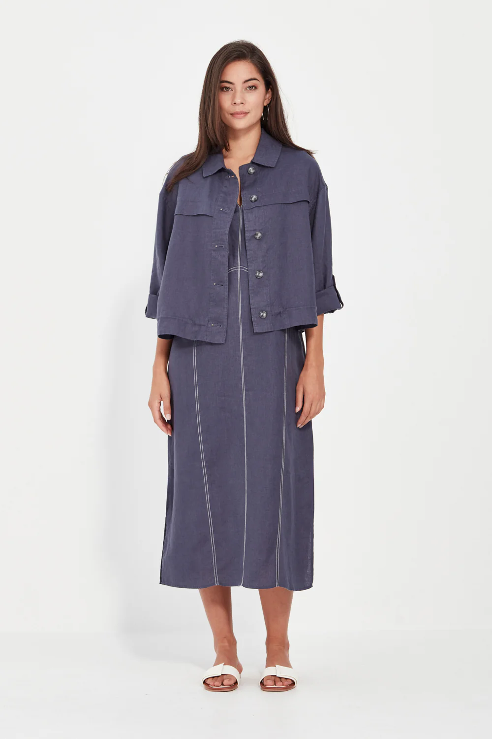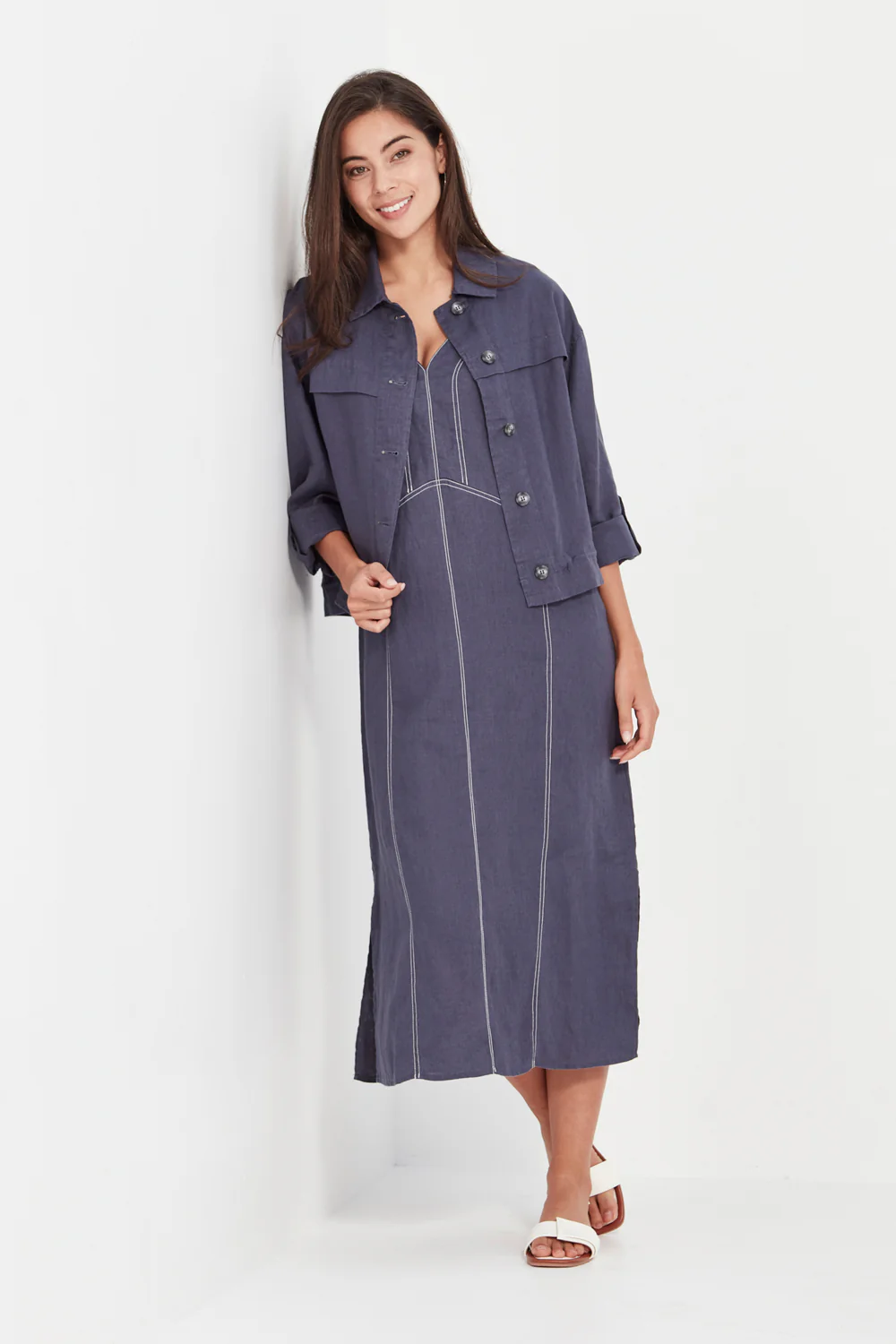 The Verge Cordelia Dress is crafted from 100% linen and designed with effortless sophistication in mind. Featuring a sleeveless V-neckline and contrast topstitching for a refined touch, it’s cut in a straight silhouette that skims the body beautifully. Falling to mid-calf with side splits for comfort and movement, this versatile piece transitions seamlessly from relaxed days to elegant evenings.