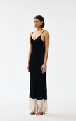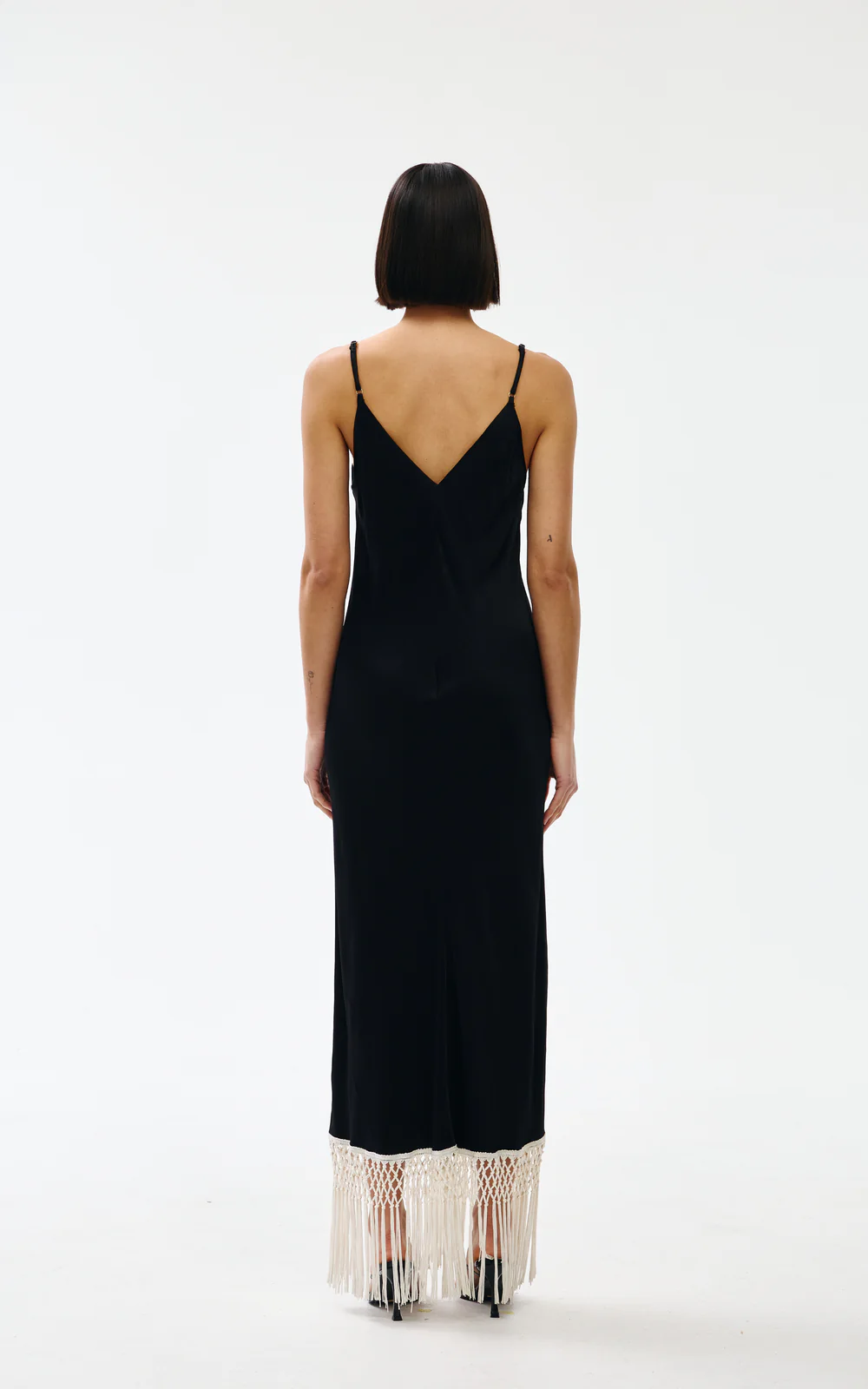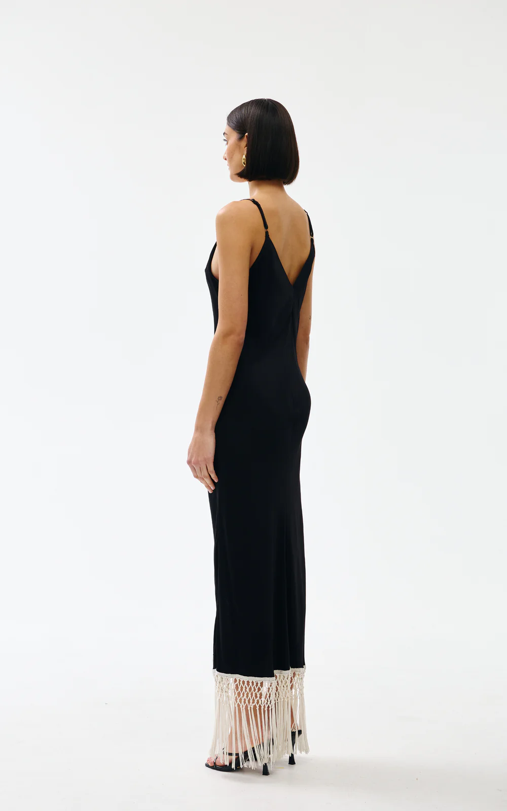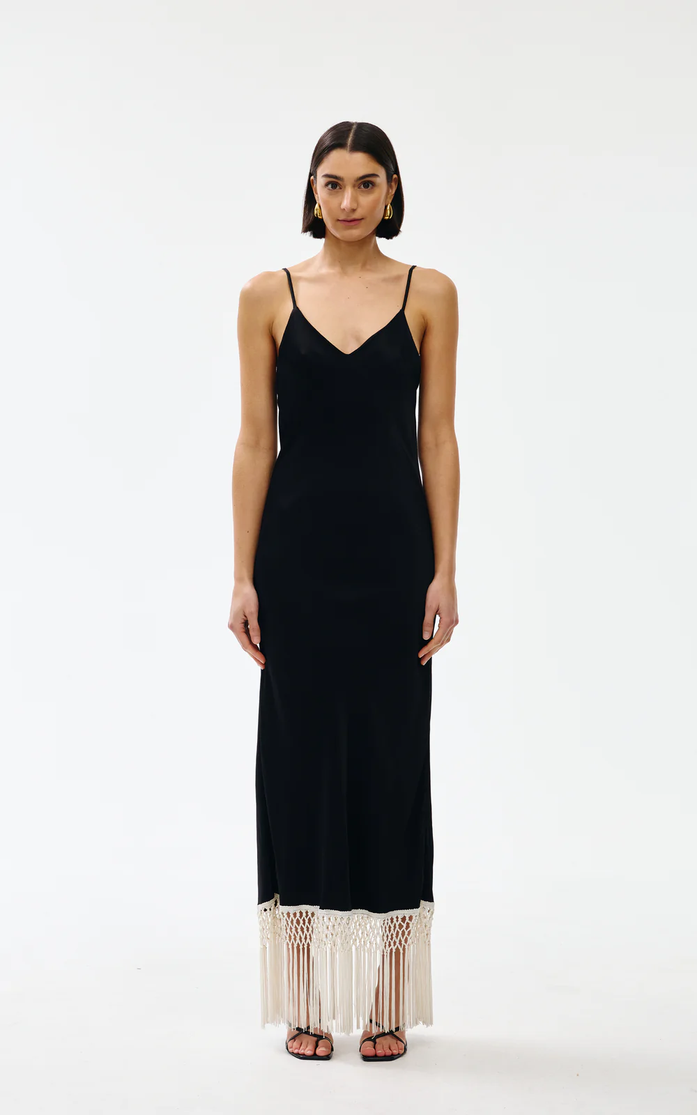 The Kinney Dolly Dress is classic silhouette while being a statement piece with a playful twist. Crafted from a soft viscose blend, this maxi dress features a classic black base trimmed with contrast ivory fringe along the hemline for a fun point of difference.