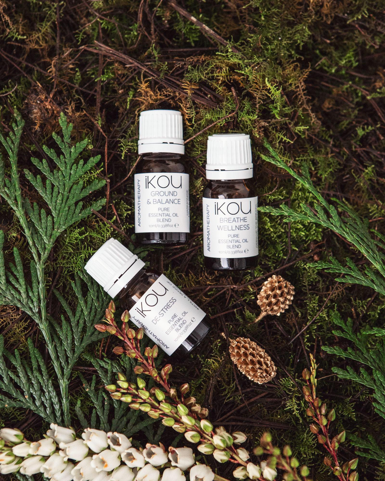 The iKOU Essential Oil Trio features three of iKOU's most popular 100% pure aromatherapy blends: De-Stress, Ground & Balance, and Breathe Wellness.