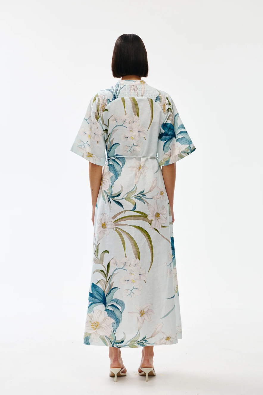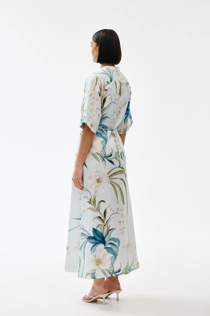 The Gigi Dress in Portofino by Kinney is a celebration of breezy coastal style. Featuring a flowing shirt-style silhouette with a soft botanical print, this dress can be cinched at the waist with a detachable tie for adjustable shape and comfort.