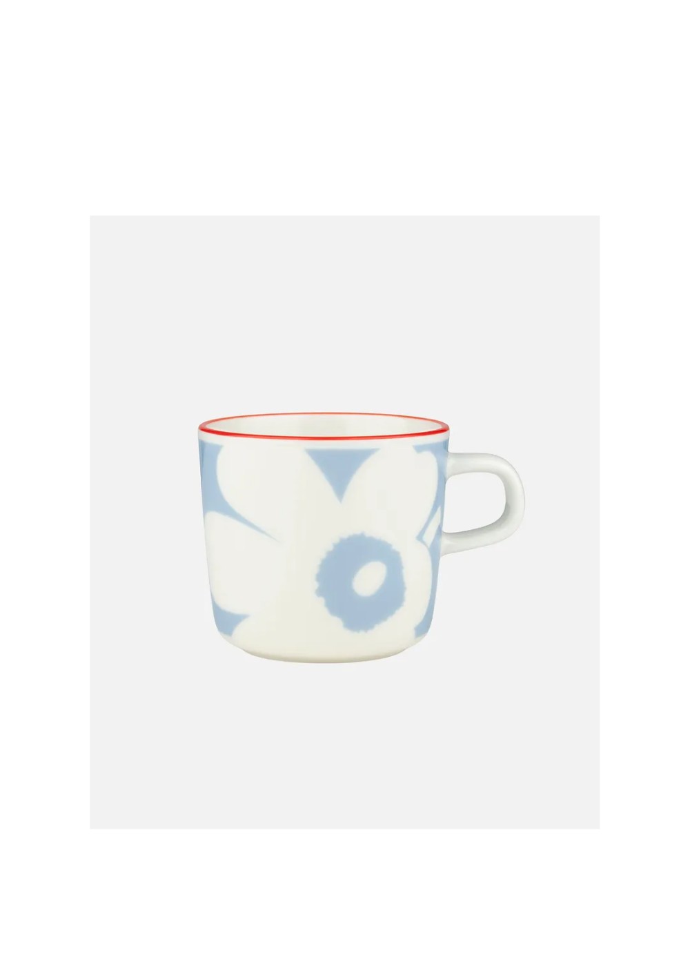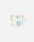 The Marimekko Oiva coffee cup features the Juhla Unikko pattern and an orange, hand painted rim. The coffee cup is dishwasher, oven, microwave, and freezer safe.