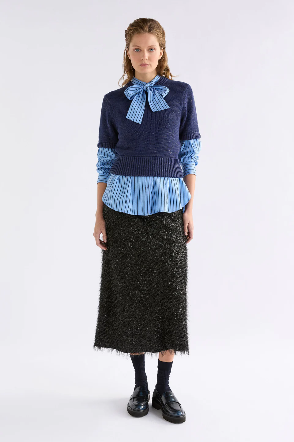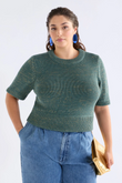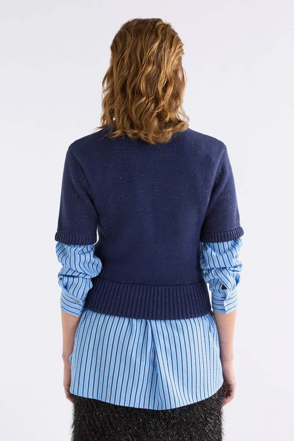 The ELK Luft Lurex Knit Top is a chunky knitted top in a soft organic cotton yarn with a fine metallic thread woven throughout, creating a gentle shimmer. This close fit, short sleeve sweater features a slightly cropped body length and double rib finish at the hem, neck, and sleeves. Its classic shape makes it a timeless wardrobe staple and the perfect warm layer to take you from every day and into the evenings, pair with high-waisted trousers for a playful, elevated look.