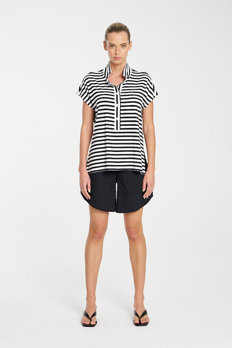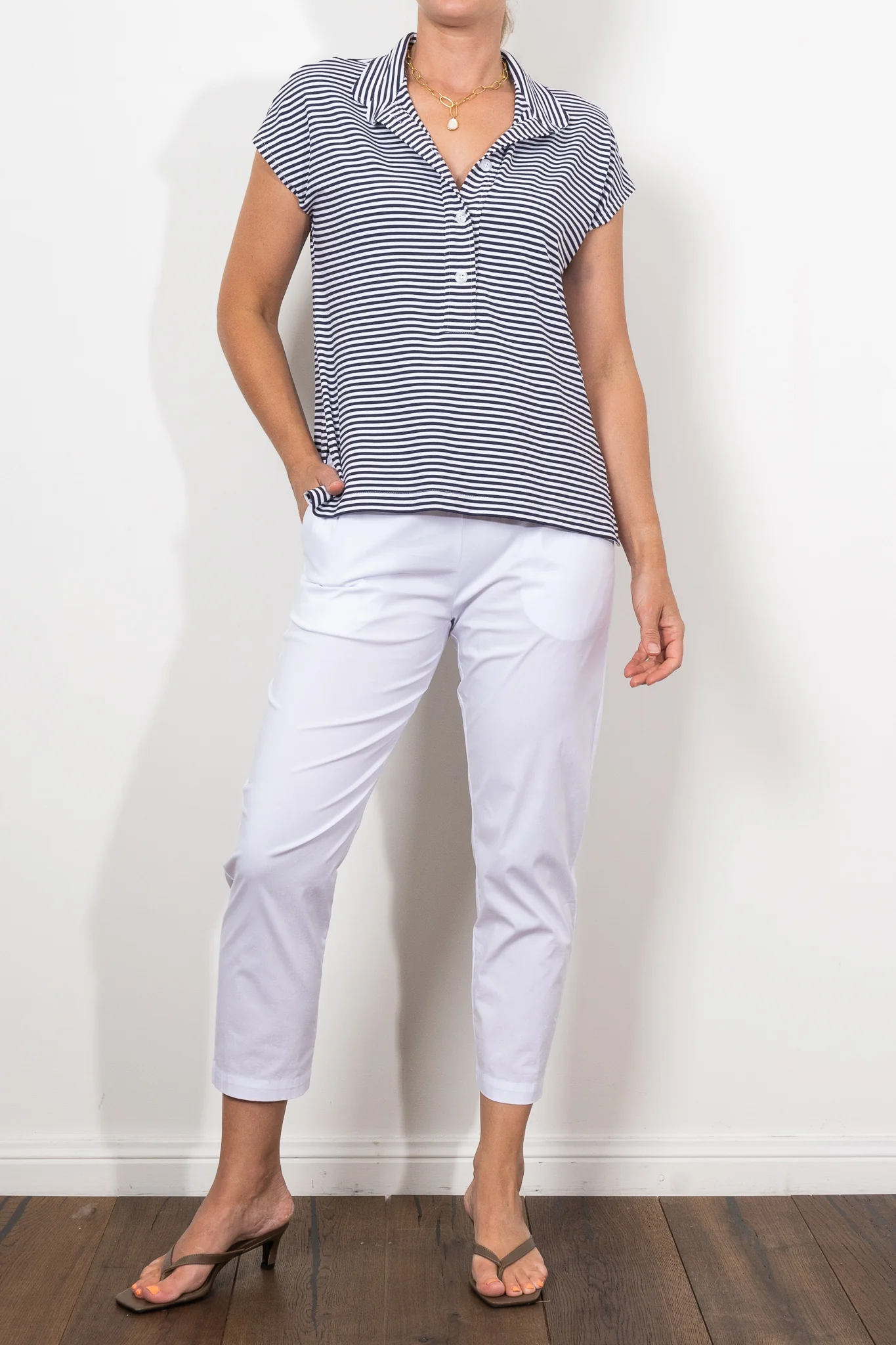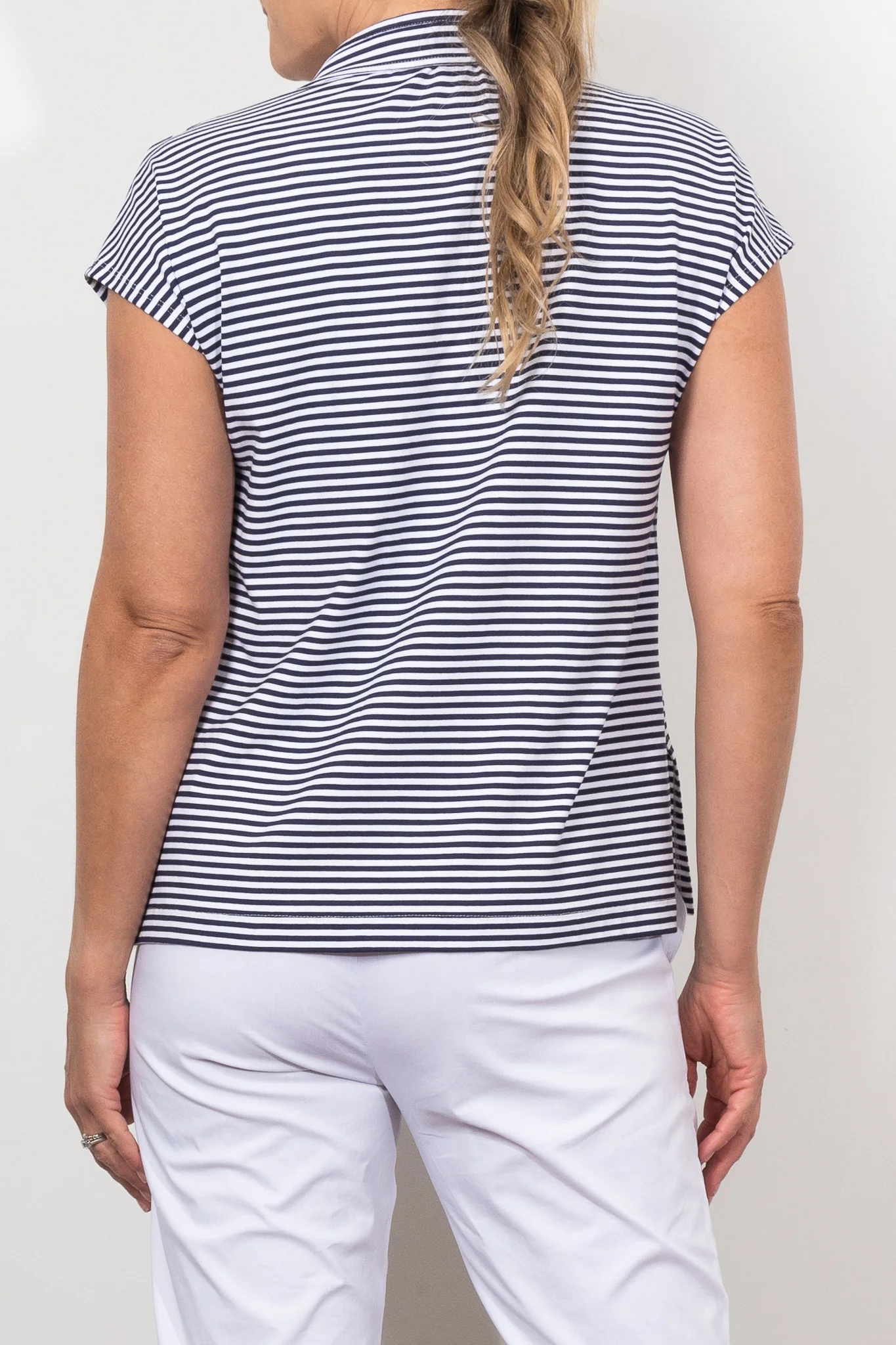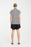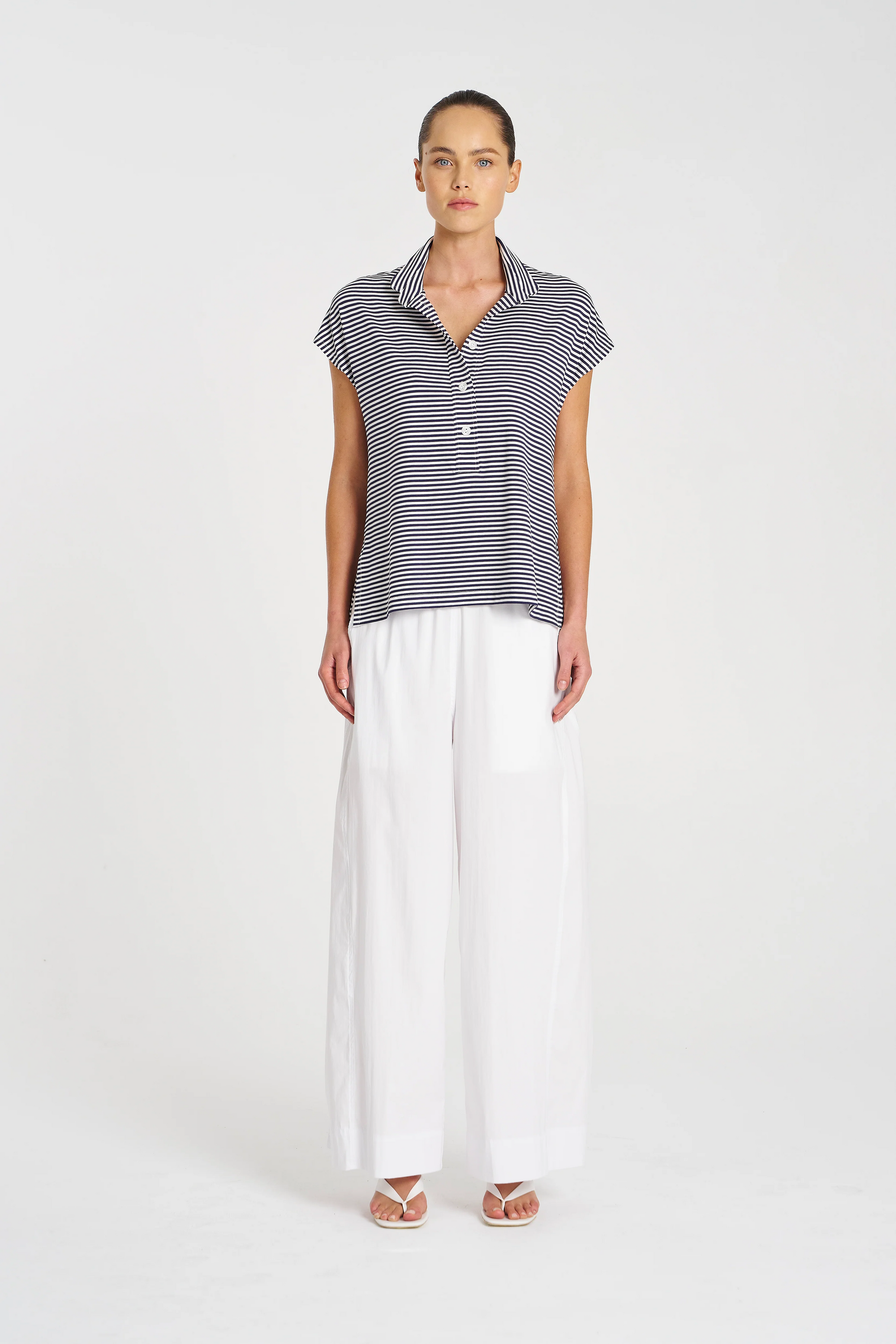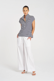 This flattering and versatile tank is cut in Mela Purdie’s signature Yacht Stripe Jersey, offering stretch comfort with a polished finish. Featuring a tab and button closure at the neckline, cap sleeves, and side splits for ease of movement, it’s the perfect trans-seasonal piece to layer or wear solo. A reliable staple with timeless appeal.