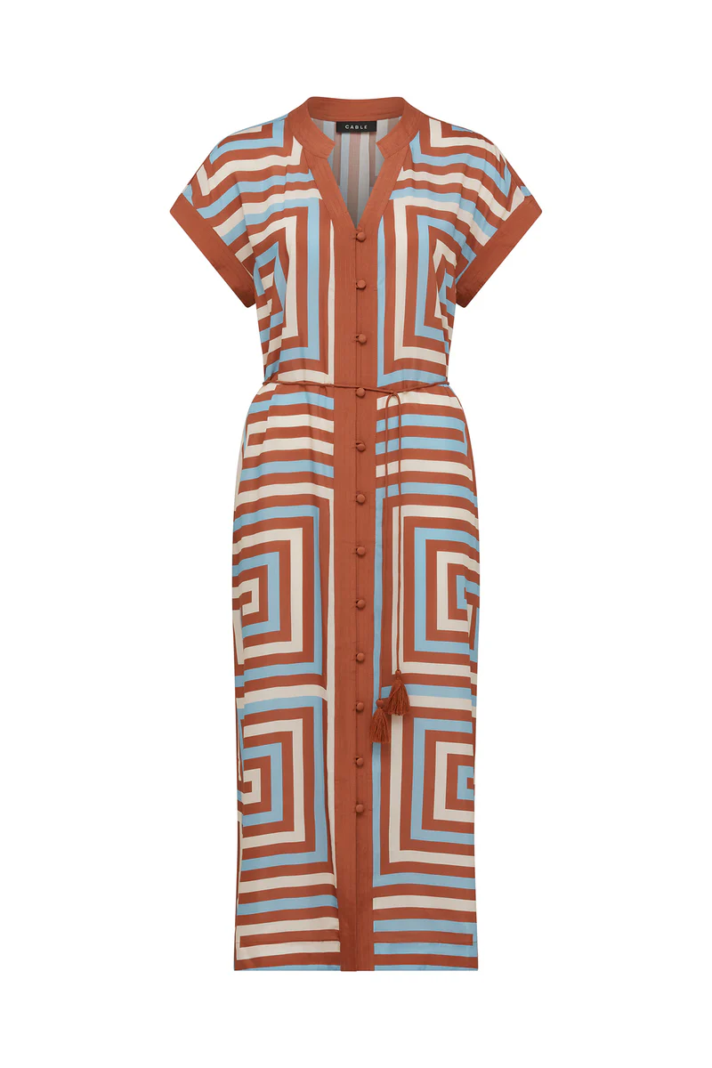 The Cable Melbourne Sierra Dress is a regular fit style made from a lightweight silk blend in an exclusive print. It features a button-through front, side pockets and a contrast fabric tie finished with tassels. A versatile dress designed to stand out with its bold pattern.