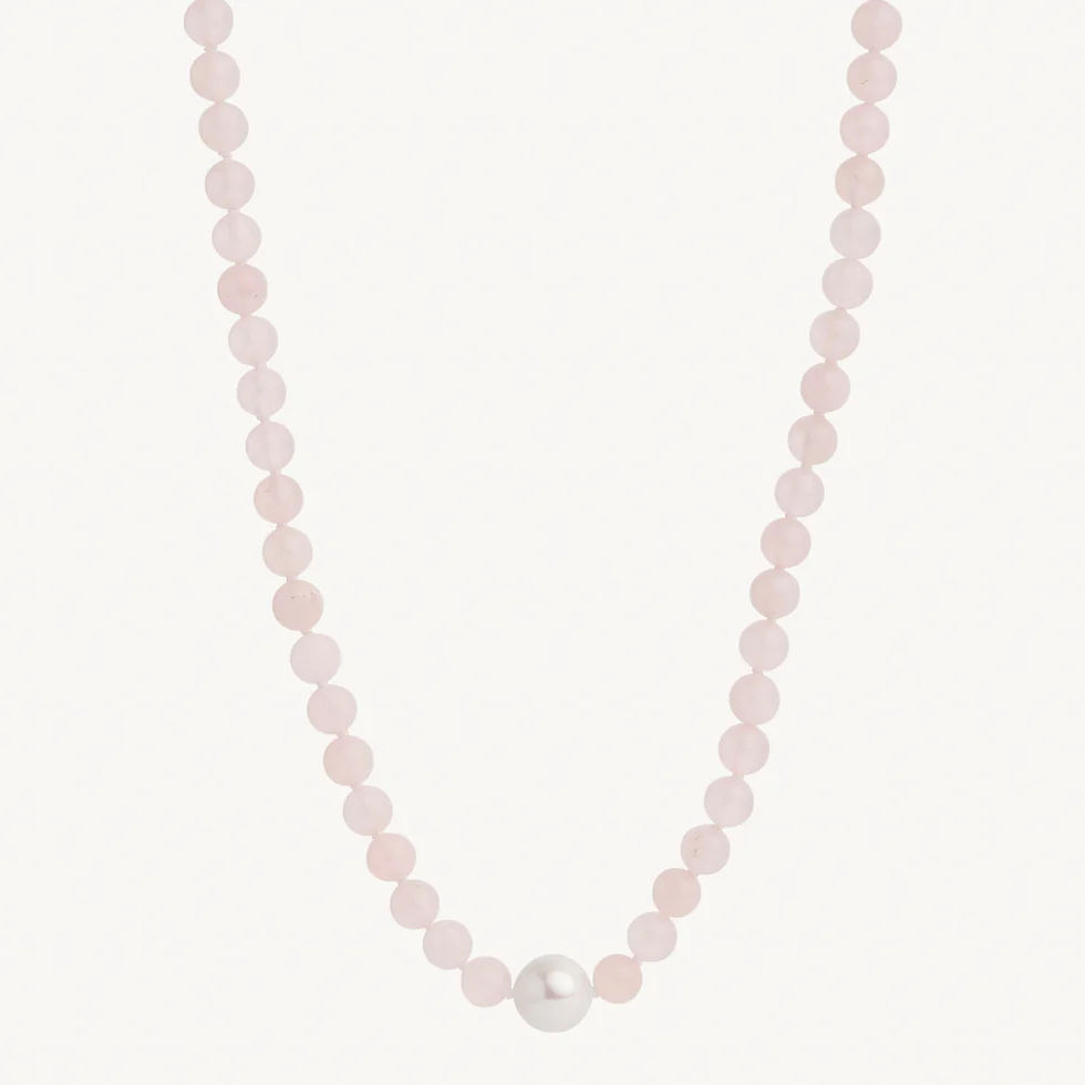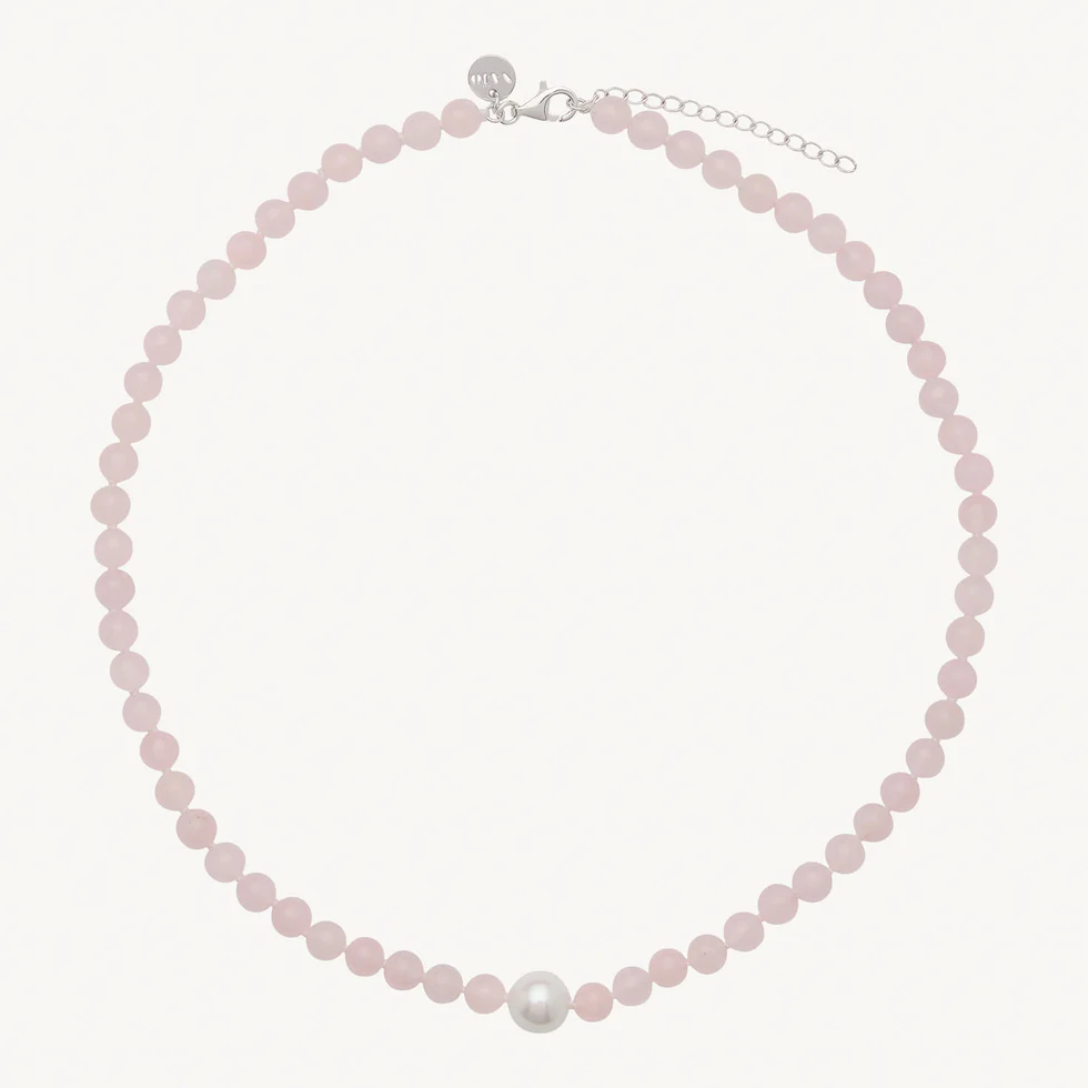 The NAJO Sunset Necklace captures the pink luminosity of evening light over water. Draped around the neck, her chain of rose quartz gemstones and a single lustrous freshwater pearl diffuse an ethereal glow. A study in fluidity and form, this creation harnesses the stone of universal love, offering romantics the most elegant modern talisman. Style her in solo splendour or use the generous silver extension to play with lengths for layering.