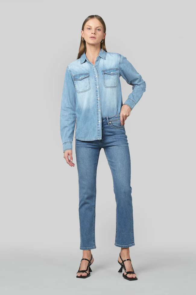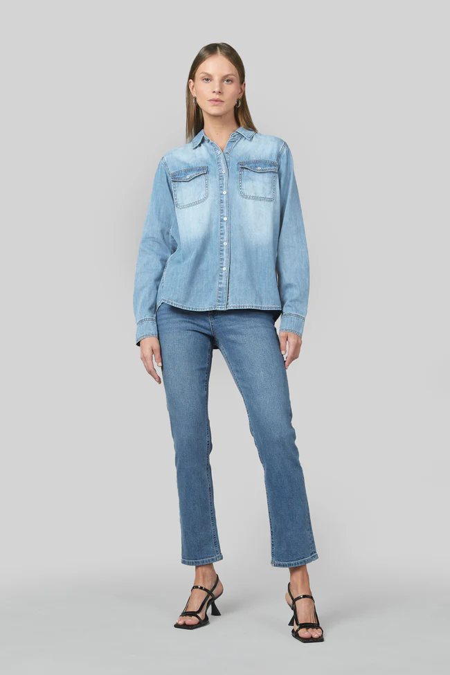 This premium denim shirt for women from Dricoper features a classic western-style, long-sleeved design that is built to last. The shirt's curved bottom hem adds a touch of elegance.